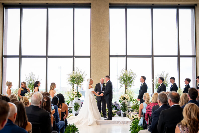 Kallie and Zac began their day with a ceremony at Seneca One Tower, surrounded by the city skyline. It was such a unique way to start the celebration — modern, bright, and filled with anticipation. From there, guests made their way to The Admiral Room, where the celebration truly began.